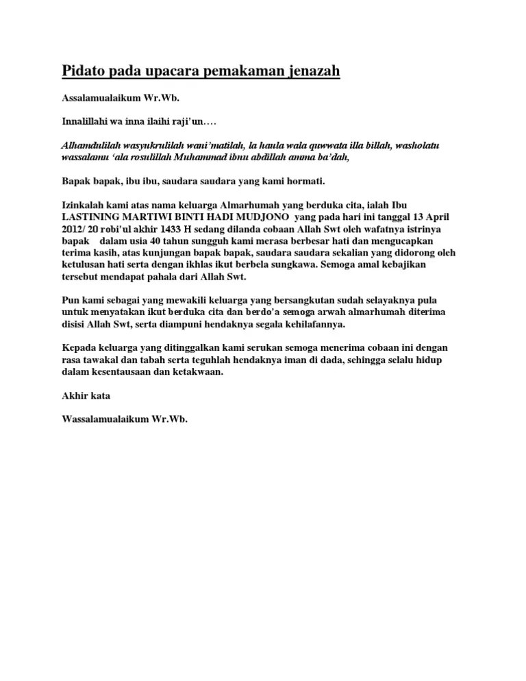 Tapi paling tidak dengan adanya dukungan, . Perkuliahan.com tentang contoh sambutan pidato duka/ kematian, . Namun ucapan berduka cita ini setidaknya bisa . Pengadaan barang dan jasa · ucapan selamat/duka cita · penerimaan pegawai · galeri foto; Berikut ini adalah beberapa contoh kata sambutan keluarga meninggal.